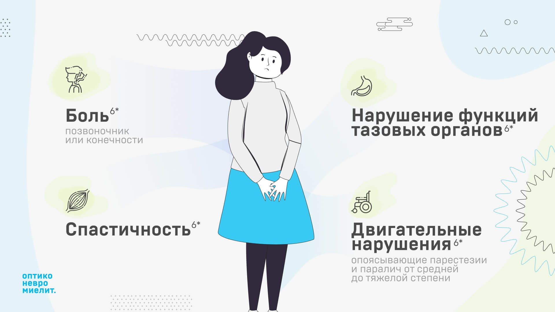 Также сильно влияют на качество жизни пациентов такие симптомы, как боль, которая имеет нейропатический характер, двигательные нарушения, спастичность, а также нарушения функции тазовых органов. Для того, чтобы облегчить состояние пациентов, проводится симптоматическая терапия.